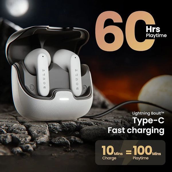 10 mins charge = 100 mins playtime. Lightning Boult Type-C fast charging makes this possible, getting your buds ready in no time.
